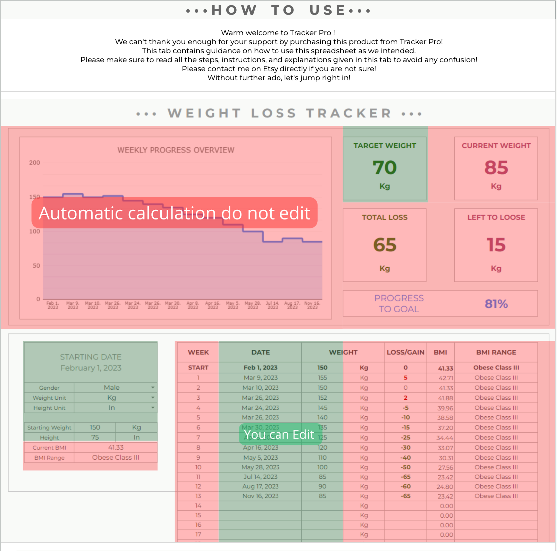 It’s a simple, structured tracker that helps you log weight, workouts, and progress visually so you can stay consistent and see results over time.
